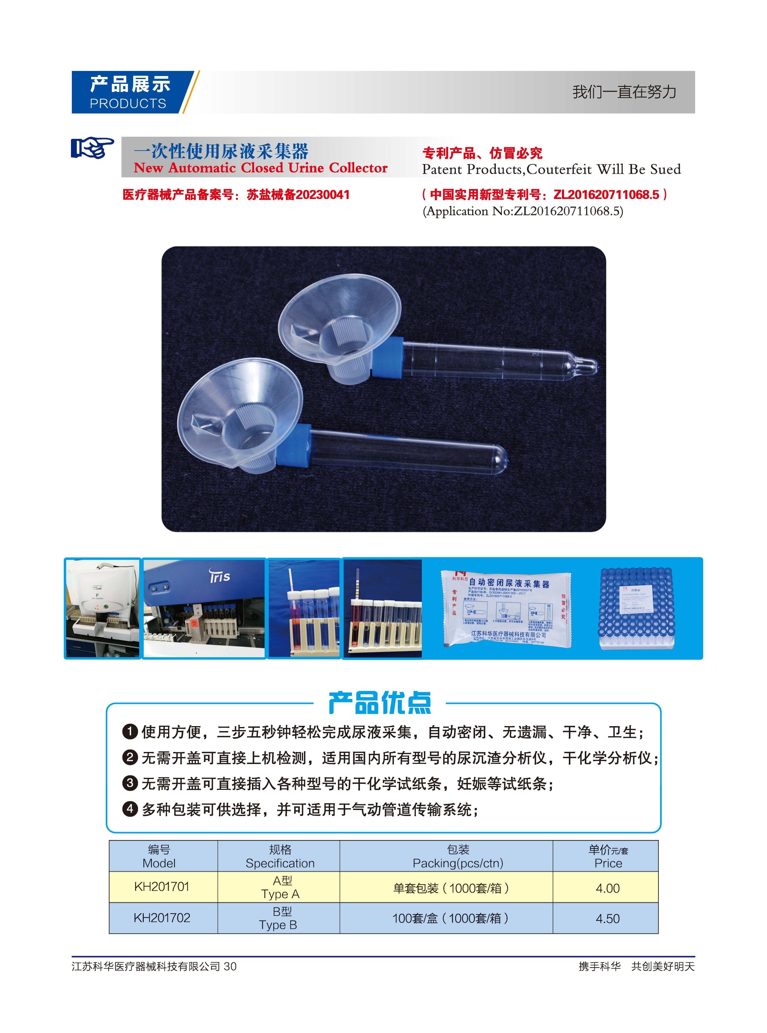 科华医疗生产的一次性使用尿液采集器,自动密闭式设计,防漏防污染。适用于临床尿液标本采集。通过CE和ISO 13485认证。